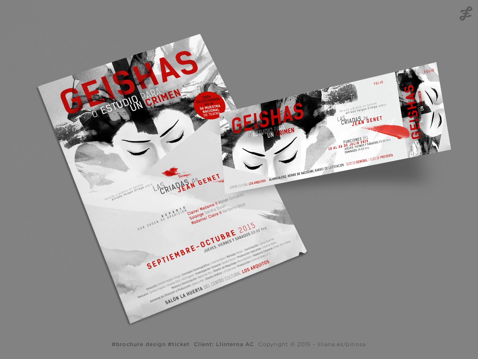 Advertising : Geishas | Performing Arts -Poster, brochure, ticket design for Geishas, theatre play in México My client wanted to have a dramatic poster for his theatre play without being too violent. "Study for a crime" is the title play, so I used gray shades with a very vivid red for the title and little details, mouth and small marks. I made poster, booklet and ticket design for them.
